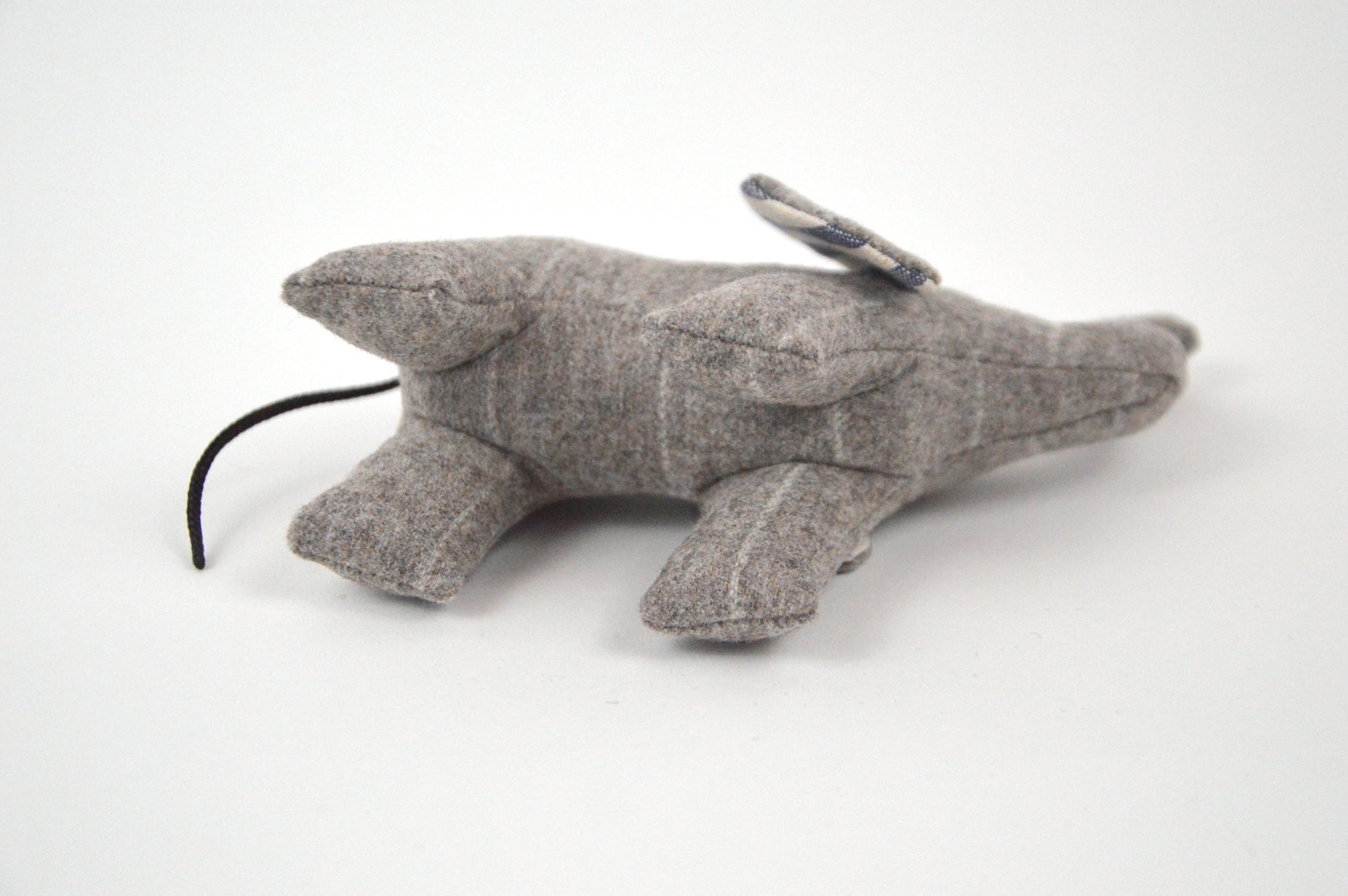 It's handmade of the finest wool tweed, ears are lined with blue and white striped cotton fabric. Eyes are felted with wool and a tail is made of polyester cord.
